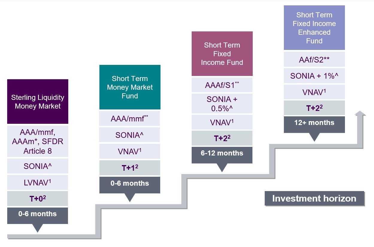 Our range takes targeted exposure to traditional money market instruments such as certificates of deposit, and then for funds that have a longer investment horizon, adds high quality short-dated credit exposure such as covered bonds, to enhance return while maintaining a focus on security.