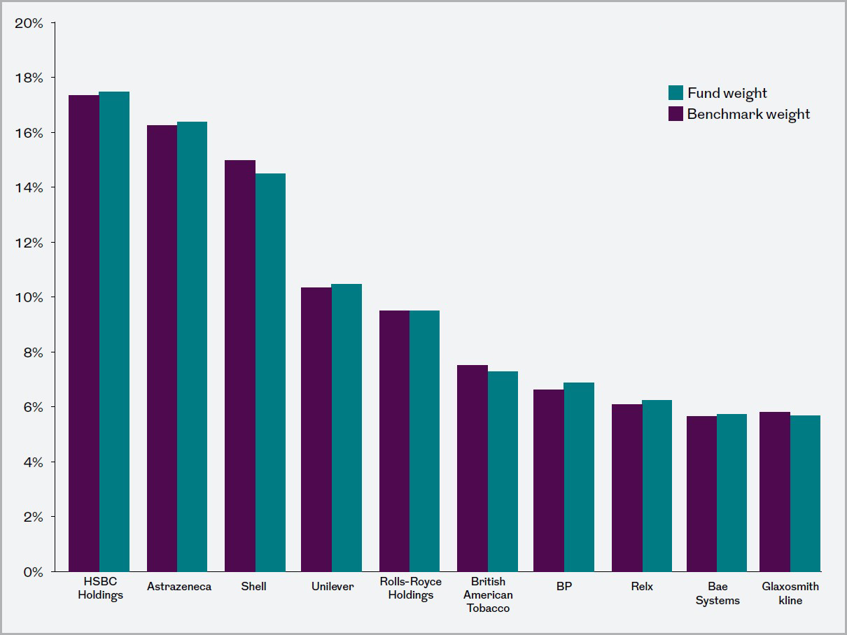 For example, let’s take a simple ten stock portfolio (based on the ten largest stocks in the Royal London UK Equity Core Tilt Fund). Purple bars represent the weighting of each stock in the benchmark and turquoise bars show the exposure in the tilted portfolio, where stocks with lower carbon scores are slightly overweighted and those with higher scores are underweighted. Although these are very small tilt positions, the cumulative effect of these is a reduction of weighted average carbon intensity of 1.5%.